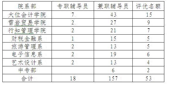 4.定等比例:优秀等级比例为辅导员总人数的30%,其余考核等级不定比例,考核等级为优秀的授予优秀辅导员,学年度内获得“全省高校优秀辅导员”等称号的不占院系评优名额。具体名额分配如下: