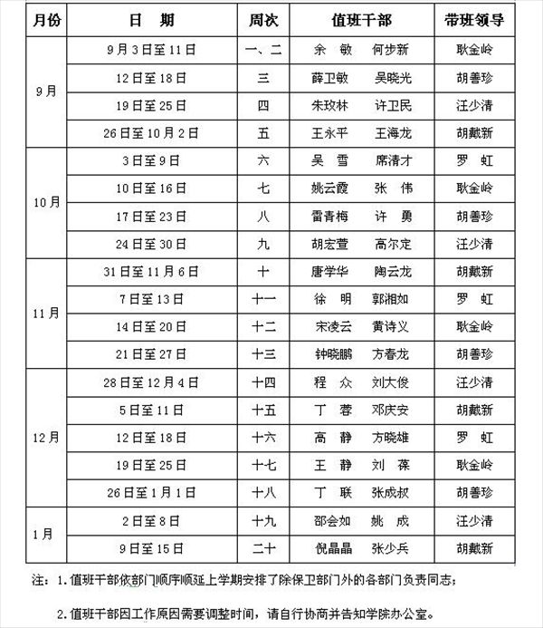 2016-2017学年第一学期总值班表