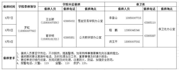 根据校历安排,学院2019年端午节放假时间为6月7日至9日,请做好假期值班、安全等工作。假期学院总值班表如下: