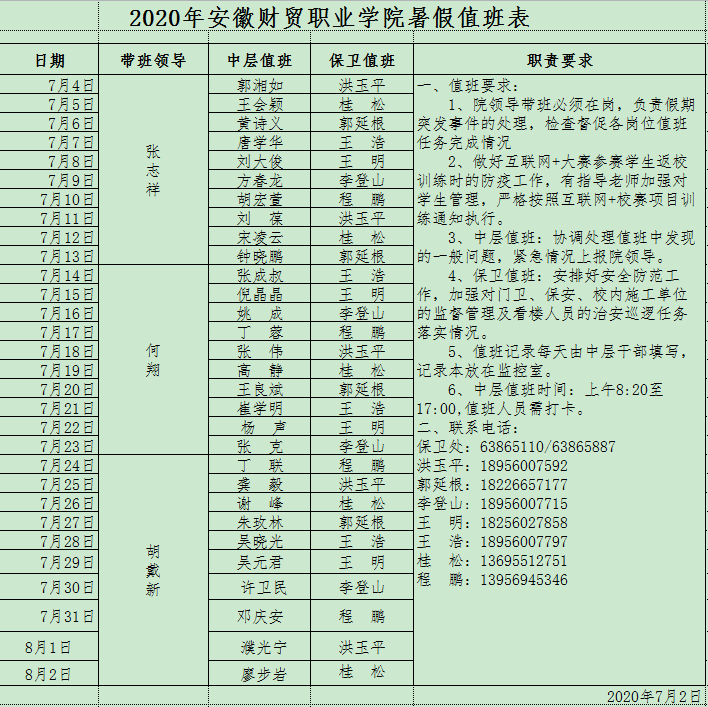 2020年暑假值班表