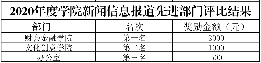 根据《学院新闻信息报道奖励办法》(院办字〔2018〕44号)文件规定,现予公布2020年度学院新闻信息报道先进部门评比结果。