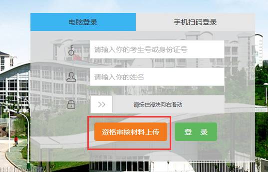 在教育厅尚未下达报考信息前,我校开通免登录模式的材料上传功能。在页面上直接点击“资格审核材料上传”,认真阅读上传须知后,输入身份证号、手机号、户籍所在地、考生类别等信息,按照要求提示上传相关证明材料照片,点击提交即可完成资料上传,并于提交后3日内,重新登录平台查看审核结果。