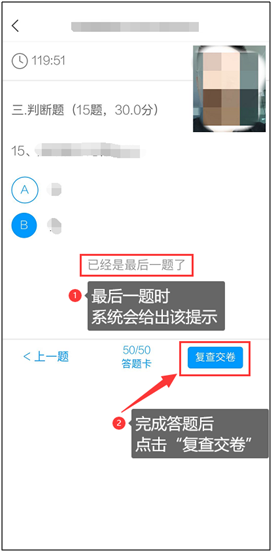 4、开始答题并交卷:每题选择正确答案点击该选项即可,点击右下角“下一题”继续作答;到最后一题时系统会提示“已经是最后一题了”,可点击“复查交卷”进行答题情况核查。