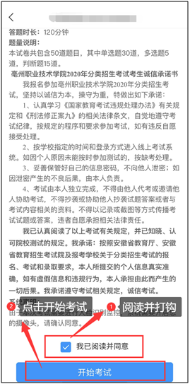 2、点击考试按钮,阅读并同意考生承诺后进行打钩,点击“开始考试”;