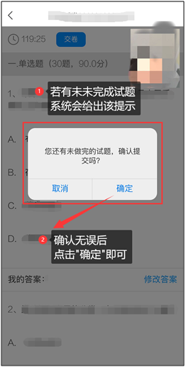 5、核查作答情况时,可修改选择答案;确认无误后,点击最上方的“交卷”按钮,并确认提交。(若存在未作答题目,系统会提示,请注意核查!)