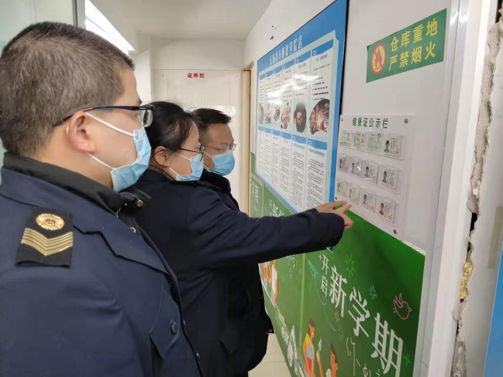 检查组一行围绕我校开学各项常态化疫情防控工作落实情况,仔细查阅了我校医务室医疗机构执业证、医务人员执业医师资格证、学校卫生各项医疗制度、传染病及突发公共卫生事件应急预案及新冠肺炎疫情防控应急处置预案组织落实情况;检查组还实地查看了学校医务室设置情况、隔离观察室设备等。并对校园内食堂、超市工作人员从业健康证、食堂超市食品安全、原材料采购索票索证等是否齐全进行了详细检查。